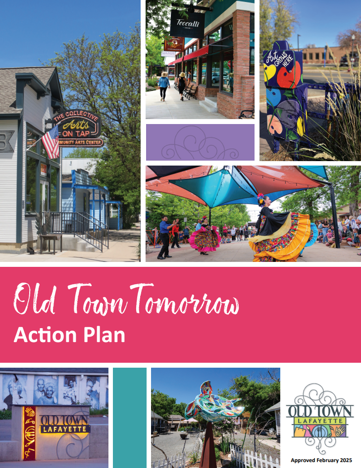 The Old Town Tomorrow Action Plan is a guiding document that will serve as the "plan of development" for the Lafayette DDA, as required by the state statute. It was developed after extensive community outreach and is based on the City's Comprehensive Plan and other adopted strategic plans. This plan will provide guidelines for projects and improvements that the DDA can fund. It sets forth goals and strategies in six priority areas: